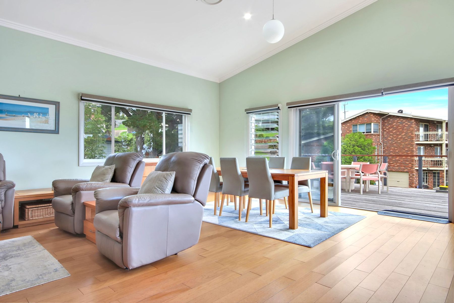 A step down leads you into the open-plan living area, complete with a well-appointed kitchen offering ample storage and filtered ocean views. The living space flows seamlessly out to a spacious deck, ideal for entertaining family and friends while enjoying the coastal breeze.